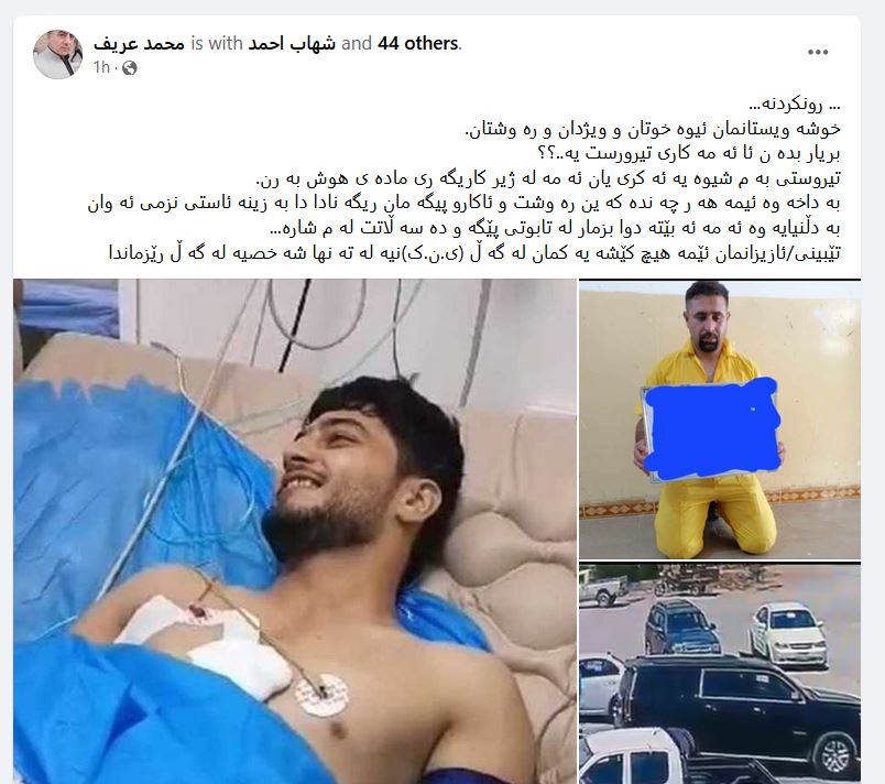 باوكی گەنجە بریندارەكەی خورماتوو دەڵێت: كێشەمان لەگەڵ یەكێتی نیە، كێشەكە شەخسیە، بە پێی گرتەیەكی ڤیدیۆیی كامێراكانی چاودێری, كە ئەمڕۆ بڵاوكراوەتەوە, مەلا كەریم شكور, لەبەردەم بارەگای مەڵبەندی حەمرینی یەكێتی نیشتمانی كوردستان, لە قەزای دووزخوماتوو, بانگهێشتنامەیەكی لەلایەن دوو گەنجەوە پێدەدرێت, پاش خوێندنەوەی, بانگهێشتنامەكە دەدڕێنێت و پاسەوانەكانیشی پەلاماری دوو گەنجەكە دەدەن.