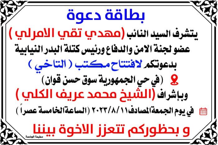 بانگهێشتنامەكە بەمەبەستی كردنەوەی نوسینگەیەكە بەناوی (التاخی) بۆ (مەهدی تەقی ئامرلی) سەرۆكی كوتلەی بەدر لە پەرلەمانی عێراق كە محەمەد عەریف گلی كەسایەتی كوردی دووزخورماتوو و باوكی گەنجە بریندارەكە سەرپرەشتی دەكات , دەوتریت ئەم نوسینگەیە, نوسینگەی حەشدی شەعبیەو هەوڵی چەكداركردنی لاوانی كورد دەدات لە قەزاكەو هەنگاوێكە بۆ درووستكردنی حەشدی كوردی, ئەمەش بەرپرسانی یەكێتی لەو قەزایە نیگەران كردووە.