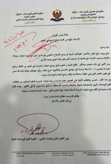 بەپێی نوسراوەكە هەمان رۆژ محەمەد شیاع سودانی سەرۆكی ئەنجومەنی وەزیرانی عیراق داواكارییەكەی وەزیری خویندنی باڵای هەرێمی كوردستانی پەسەندكردوەو لایەنە پەیوەندیدارەكانی راسپاردووە بۆ جیبەجیكردنی ناوەرۆكی نامەكەی وەزیری خوێندنی باڵای هەریم، بۆ دابینكردنی پشكی پارێزگاكانی هەرێمی كوردستان لە بەرنامەی نێردراوان كە ژمارەیان (5) هەزار كورسییە ..