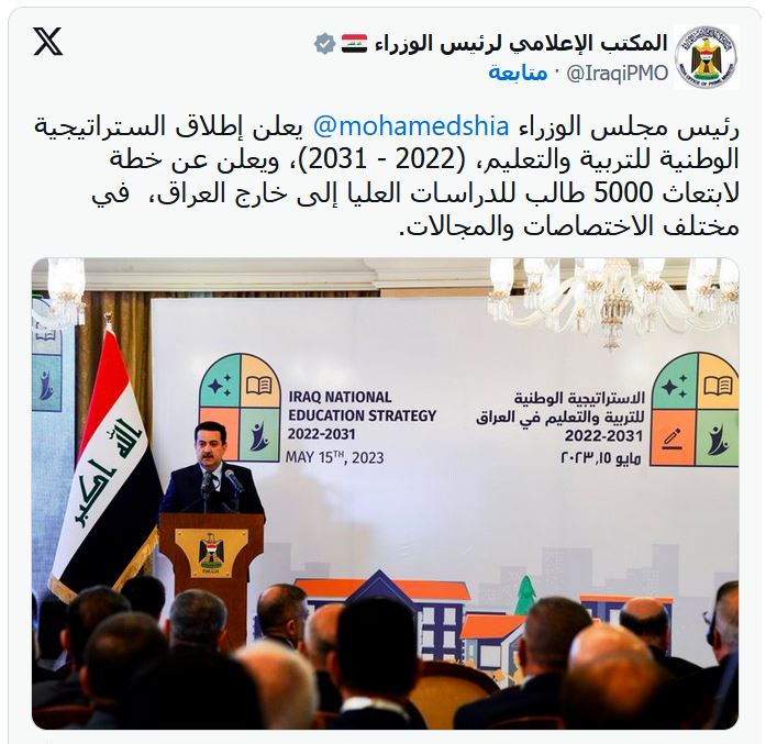 لە مانگی ئایاری رابردوودا محەمەد شیاع سودانی سەرۆك وەزیرانی عێراق لە چوارچێوەی بەرنامەی ستراتیژیەتی پەرەپێدانی كەرتی پەروەردەو خوێندنی باڵا ناردنەدەرەوەی (5) هەزار قوتابی راگەیاند لەسەرجەم بوارو پسپۆڕییەكاندا.