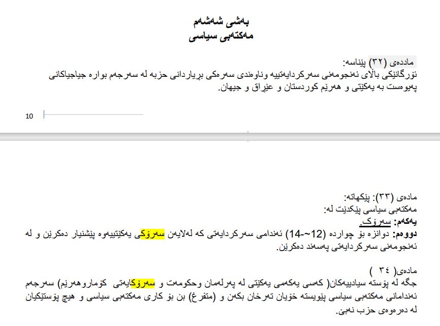 بە پێی رەشنوسی پەیڕەوی ناوخۆی یەكێتی كە بڕیارە ئەمڕۆ پەسەند بكرێت و ئەندامانی ئەنجومەنی سەركردایەتی هەڵبژێدرێن، دەسەڵاتێكی زۆر دراوە بەسەرۆكی یەكێتی، سەرۆكی ئەنجومەنەكانی یەكێتی و دیاریكردنی ئەندامانیان و تەواوی دەسەڵاتەكانی دارایی و سیاسی و رێكخستن و بەرپرسەكان دراوە بە سەرۆكی یەكێتی.