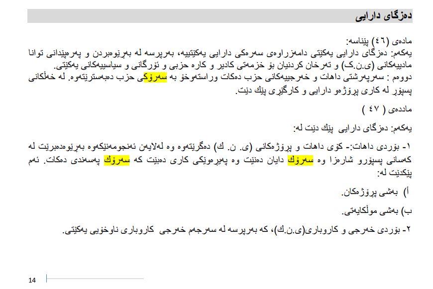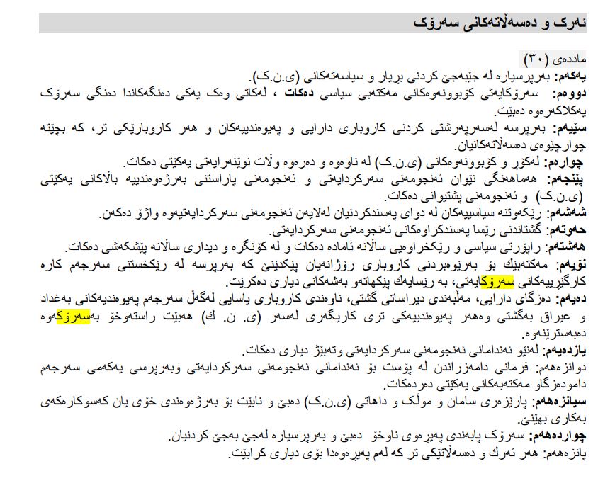 •    دەزگای دارایی، مەڵبەندی دیراساتی گشتی، ناوەندی كاروباری یاسایی، لەگەڵ سەرجەم پەیوەندییەكانی بەغداد و عێراق بەگشتی و وەهەر پەیوەندییەكی تری كاریگەر لەسەر (ی،ن،ك) هەبێت راستەوخۆ بەسەرۆكەوە دەبەسترێتەوە