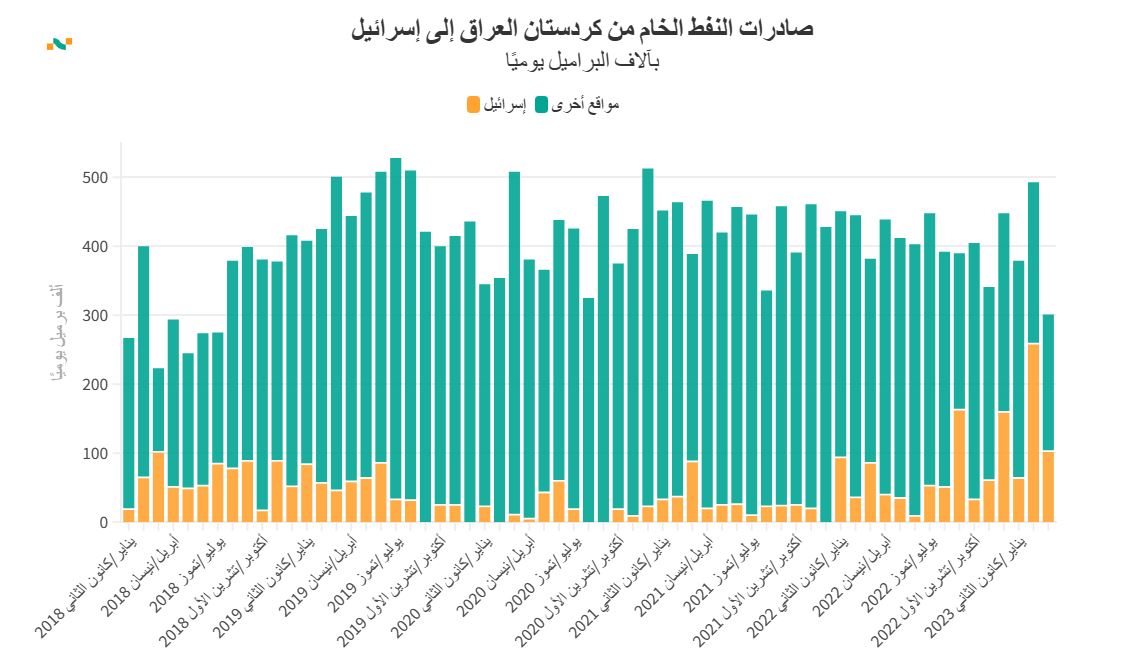 • هەتا مانگی ئازاری (2023), پێش بڕیارەكەی توركیا بە راگرتنی نەوتی باكوری عێراق, بەهۆی ململانێیەكی یاسایی لەگەڵ بەغداد, بەشێكی زۆری نەوتی خاوی هەناردەكراو لە هەرێمی كوردستانەوە رەوانەی ئیسرائیل دەكرا, لەمانگی شوباتی رابردودا, ئیسرائیل رۆژانە (183) هەزار بەرمیلی نەوتی رۆژانەی لە هەرێمی كوردستانەوە هاوردە دەكرد, كە نزیكەی نیوەی نەوتی خاوی هەناردەكراوی كوردستانی دەكرد.