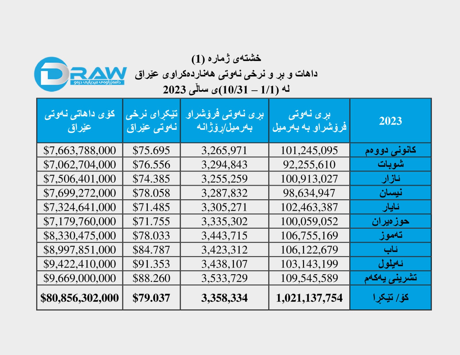? وەزارەتی نەوتی عێراق رۆژی (1 تشرینی دووەمی 2023) ئامارە سەرەتاییەکانی تایبەت بە پرۆسەی نەوتی عێراق بۆ مانگی تشرینی یەکەم بڵاو کردەوە، بەرزترین ئاستی هەناردەکردنی لە ئەمساڵدا تۆمار کردووەو گەیشتووە بە زیاتر لە (109 ملیۆن و 589 هەزار) بەرمیل نەوت و بە تێكرا هەر بەرمیلێک بە (88 دۆلار و 26 سەنت) فرۆشراوەو کۆی داهاتەکەی بریتی بووە لە (9 ملیار و 699 ملیۆن) دۆلار، ئەمەش بەرزترین ئاستی داهاتی نەوتە بەراورد بە مانگەکانی ڕابردوو، بەم پێیەش؛