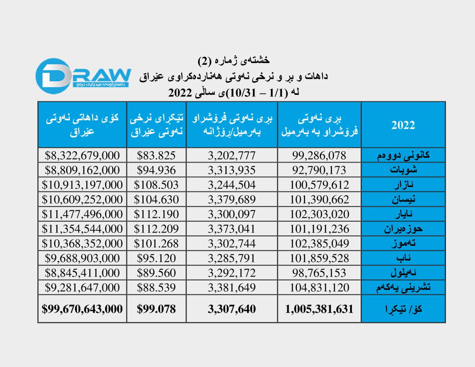 هەر بە گەڕانەوە بۆ داتاکانی دە مانگی یەکەمی ساڵی (2022)، کۆی داهاتی فرۆشراوی نەوتی عێراق لەماوەی ناوبراودا بریتی بووە لە بڕی (99 ملیار و 670 ملیۆن و 643 هەزار) دۆلار. مانگی (ئایار)یش گەورەترین داهاتی نەوتی تێدا کۆکرابوویەوەو گەیشتبووە (11 ملیار و 477 ملیۆن و 496 هەزار) دۆلار، کەمترین داهاتیش لە سەرەتاوە تا کۆتایی تشرینی یەکەمی (2022)دا لە مانگی (کانونی دووەم)دا بووەو بڕی (8 ملیار 322 ملیۆن و 679 هەزار) دۆلار داهاتی گشتی نەوتی هەناردەکراوی عێراق بووە.