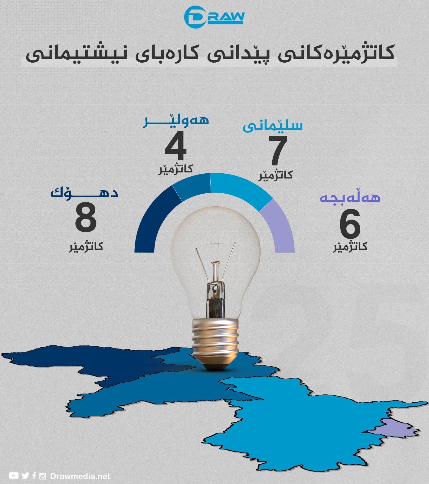 ئێستا رۆژانە كاتژمێرەكانی پێدانی كارەبای نیشتمانی لە هەرێمی كوردستان بەمشێوەیە: