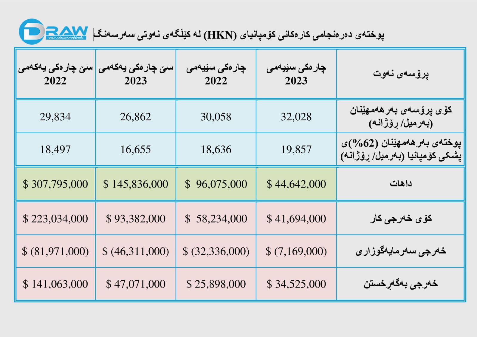 2. داهات بۆ چارەکی سێیەمی ساڵی 2023 بەڕێژەی (53.5%) کەمیکردووە لەچاو ماوەی ساڵی 2022و کەمبوونەوەکە ڕەنگدانەوەی بەرزبوونەوەی (6.6%)ی بەرهەمهێنان و دابەزینی (56.4%)ی نرخی بەدیهاتوو بووە.