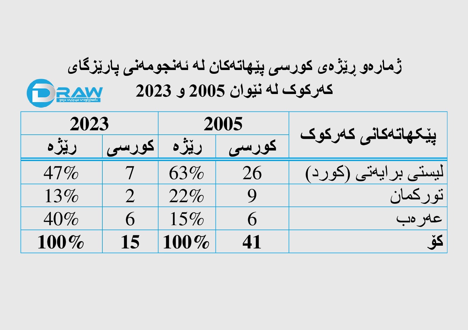 لهبهرامبهردا پێكهاتهی عهرهب ژمارهی كورسییهكانی وهكو خۆی ماوهتهوهو رێژهی لهناو كهركودا زیادی كردووه، توركمانیش هاوشێوهی كورد ههم كورسی و ههم رێژهشی كهمیكردووه.