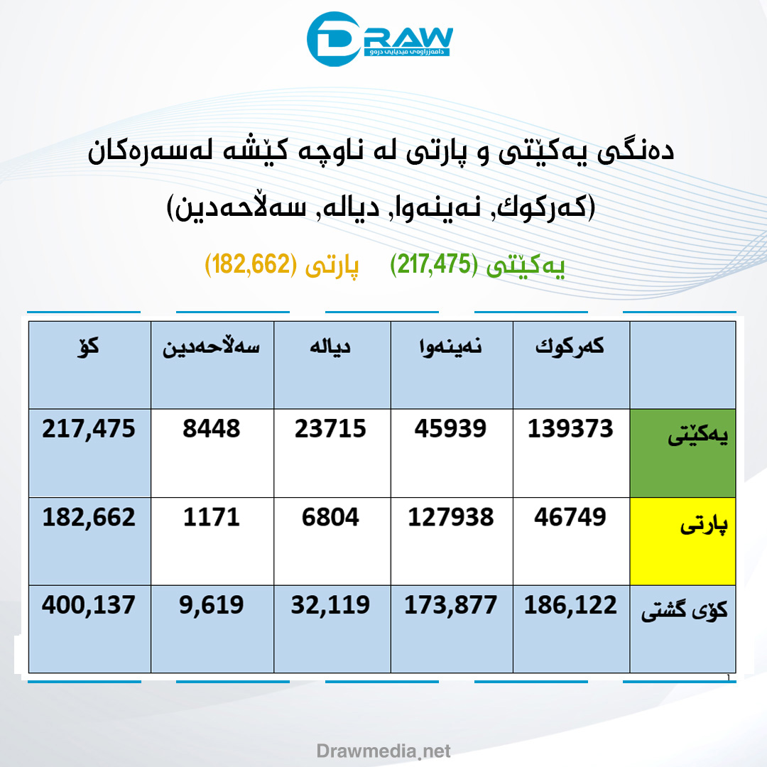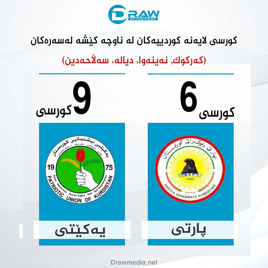 لە پارێزگاكانی (كەركوك, نەینەوا, سەڵاحەدین, دیالە) پارتی و یەكێتی (400) هەزار دەنگیان بەدەستهێناوە، یەكێتی (217) هەزار دەنگ و پارتی (182) هەزار دەنگی بەدەستهێناوە، لەو ناوچانە یەكێتی و پارتی (15) كورسیان بەدەستهێناوە، یەكێتی (9) كورسی و پارتی (6) كورسی بەدەستهێناوە.