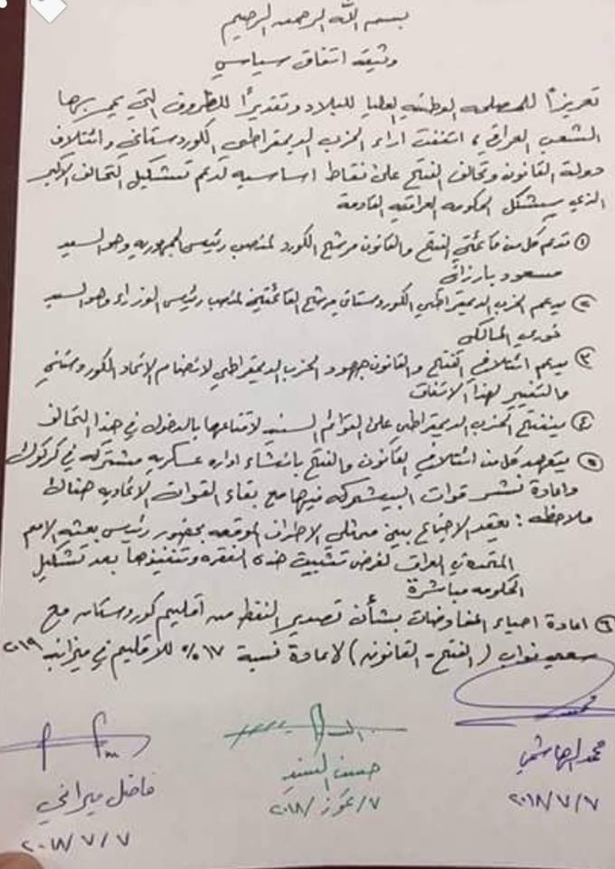 میدیاكانی عێراق دەقی رێككەوتنێكی هەردوو هاوپەیمانی دەوڵەتی یاسا و فەتح و پارتی دیموكراتی كوردستانیان بۆ پێكهێنانی گەورەترین كوتلەی پەرلەمانی و حكومەتی نوێی عێراق بڵاوكردەوە.