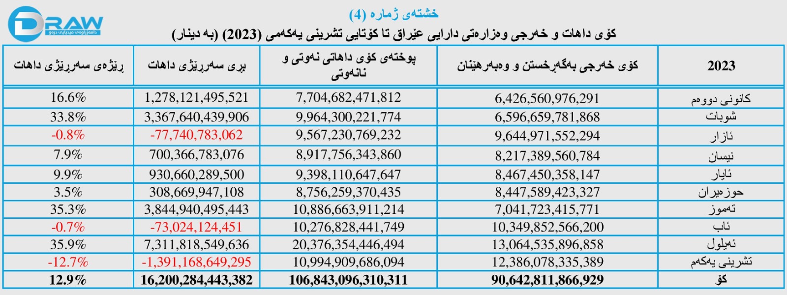 واتە بڕی (16 ترلیۆن و 200 ملیار و 284 ملیۆن و 443 هەزار و 382) دیناری بەڕێژەی (12.9%) لە داهاتی گشتی ماوەتەوە. سەبارەت بە وردەکاری مانگەکانی کانونی دووەم، شوبات، ئازار، نیسان، ئایار، حوزەیران، تەموز، ئاب، ئەیلول و تشرینی یەکەمی ساڵی (2023) بڕوانە (خشتەی ژمارە (4)).