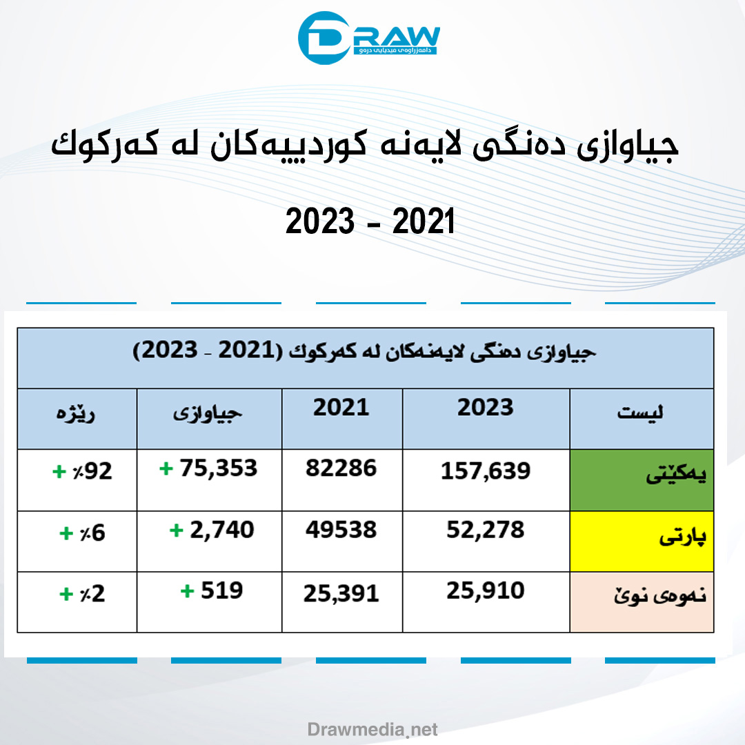 درەو: ?یەكێتی : (75,353) دەنگ زیادی كردووە بەرێژەی (92%) ?پارتی: (2,740) دەنگ زیادی كردووە بەرێژەی (6%) ?نەوەی نوێ: (519) دەنگ زیادی كردووە بەرێژەی (%2)