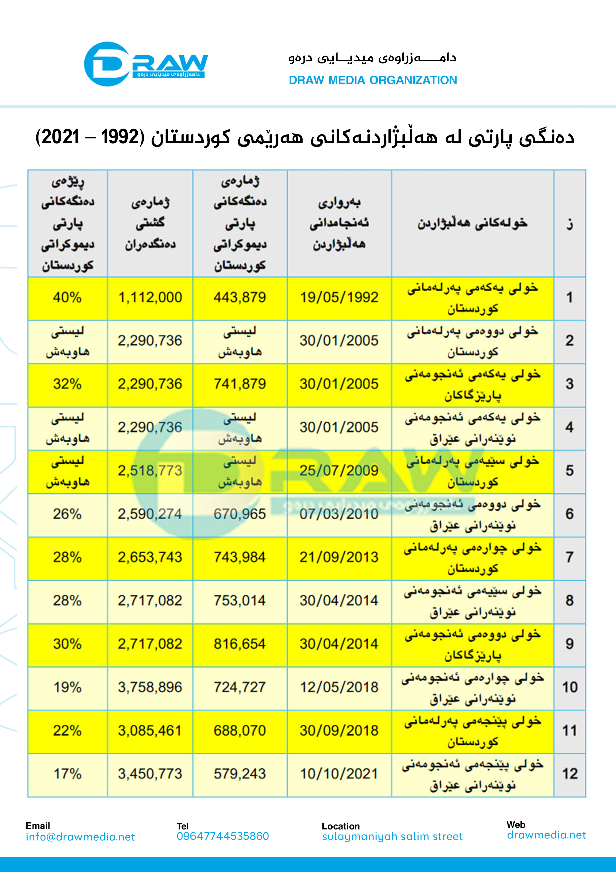 دەنگی پارتی دیموكراتی كوردستان لەسەرجەم هەڵبژاردنەكانی (پەرلەمانی كوردستان، ئەنجومەنی پارێزگاكان، پەرلەمانی عێراق) لە هەرێمی كوردستان (1992 – 2021)