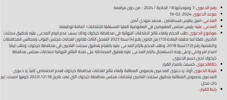ههریهكه له (ئهمیل بوتروس قوستهنتین)و (محهمهدمههدی ئهمین سهرۆكی هاوپهیمانی كركوكنا) لهبهردهم دادگای باڵای فیدراڵی عێراقدا سكاڵایان لهدژی كۆمسیۆنی ههڵبژاردنهكانی عێراق تۆماركرد، داوایان له دادگا كرد ئهنجامی كۆتایی ههڵبژاردنی ئهنجومهنی پارێزگاكان ههڵوهشێنێتهوه كه رۆژی 18ی كانونی یهكهمی 2023 بهڕێوهچوو، بهمه بههۆی ئهوهی كۆمسیۆنی ههڵبژاردن وردبینی له تۆماری دهنگدهرانی كهركوكدا نهكردووه وهكو ئهوهی له ماددهی (13)ی یاسای ژماره (4)ی ساڵی 2023ی ههمواری سێیهمی یاسای ههڵبژاردنهكانی ئهنجومهنی نوێنهران و ئهنجومهنی پارێزگاكاندا هاتووه.