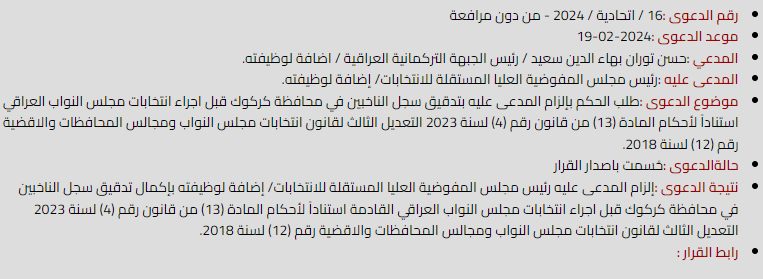 دادگای فیدراڵی فهرمانی سالاری دهرنهكردو سكاڵاكهشی رهتكردهوه، ئهمه بهبهڵگهی ئهوهی سكاڵاكه له تایبهتمهندی كاری دادگا نییه، هاوكات ئهو بهشهی سكاڵاكهشی رهتكردهوه كه داوای وردبینی دهكات له تۆماری دهنگدهرانی كهركوك دهكات بۆ ههڵبژاردنی رابردووی ئهنجومهنی پارێزگاكان.
