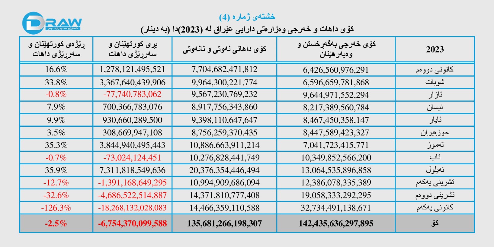 واتە بڕی (6 ترلیۆن و 754 ملیار و 370 ملیۆن و 99 هەزار) دیناری بەڕێژەی (2.5%) خەرجی لە داهات زیاتر بووەو کورتهێنان ڕویداوە، سەبارەت بە وردەکاری تەواوی ساڵی (2023) بڕوانە (خشتەی ژمارە (4)).
