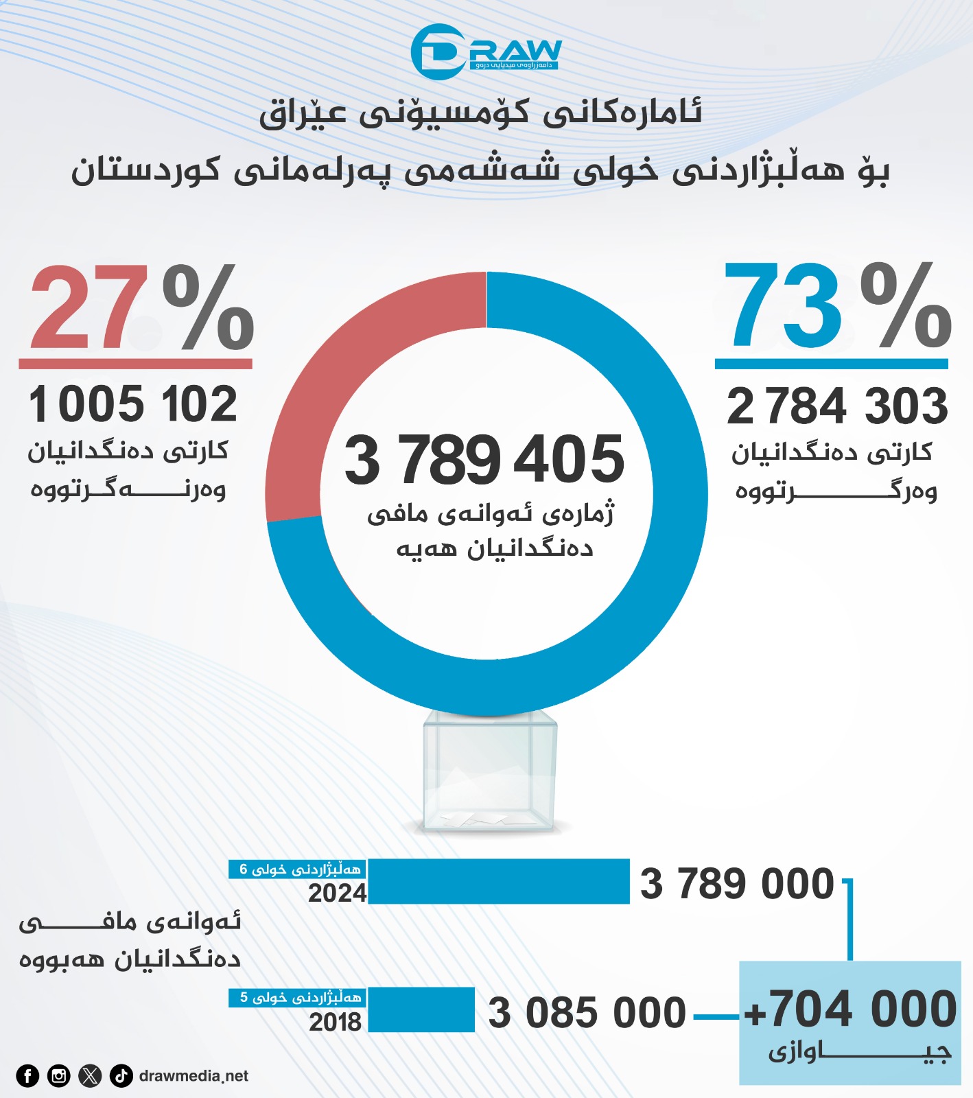 لەكۆی (3ملیۆن و 789 هەزارو 405) كەس كە مافی #دەنگدانیان هەیە، (2 ملیۆن و 784 هەزارو 303) كەس كارتی دەنگدانیان وەرگرتووەتەوە بەرێژەی (73%)، زیاتر لە (ملیۆنێك و 5 هەزارو 102) هەزار كەس كارتی دەنگدانیان وەرنەگرتووەتەوە بەرێژەی (27%) واتا هەر لەسەرەتاوە (27%)ی هاوڵاتیان بایكۆتی #هەڵبژاردن دەكەن و بەشداری ناكەن، لە نێوان خولی پێنجەم بۆ خولی شەشەمی پەرلەمانی كوردستان (704) هەزار كەس زیادی كردووەو مافی دەنگدانیان دەبێت.