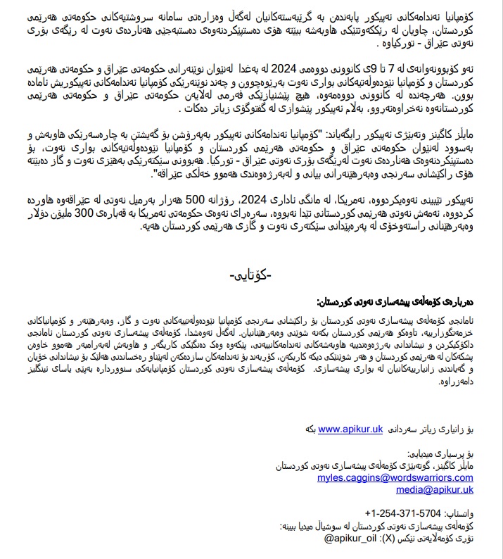 كۆمه‌ڵه‌ی پیشه‌سازی نه‌وتی كوردستان كه‌ (8) كۆمپانیای بیانی كه‌رتی نه‌وتی هه‌رێم له‌خۆده‌گرێت و به‌ "ئه‌پیكور" ناسراوه‌، راگه‌یه‌ندراوێكی نوێی بڵاوكرده‌وه‌. ئه‌پیكور له‌ راگه‌یه‌ندراوه‌كه‌یدا ده‌ڵێ: سه‌ردانه‌كه‌ی سه‌رۆك وه‌زیرانی عێراق بۆ كۆشی سپی ده‌رفه‌تێكه‌ بۆ به‌ره‌وپێشچوون به‌ئاڕاسته‌ی كردنه‌وه‌ی بۆری نه‌وتی عێراق- توركیا.