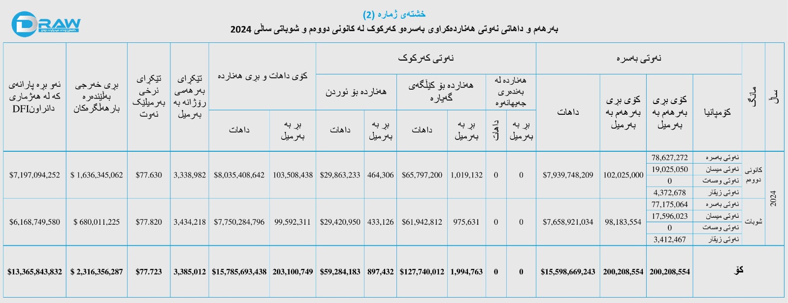 ? بەم پێیە لە مانگەکانی کانونی دووەم و شوباتی (2024)دا، لەسەر ئاستی سەرجەم کێڵگە نەوتییەکانی عێراق بڕی (203 ملیۆن و 100 هەزار و 749) بەرمیل نەوتی خاو هەناردە کراوە و بە تێکڕای ڕۆژانەی (3 ملیۆن و 385 هەزار و 12) بەرمیل نەوتی خاو، هەر بەرمیلێک بە تێکڕا فرۆشراوە بە (77.723) دۆلار و کۆی داهاتەکەشی (15 ملیار و 785 ملیۆن و 693 هەزار و 438) دۆلار بووە.