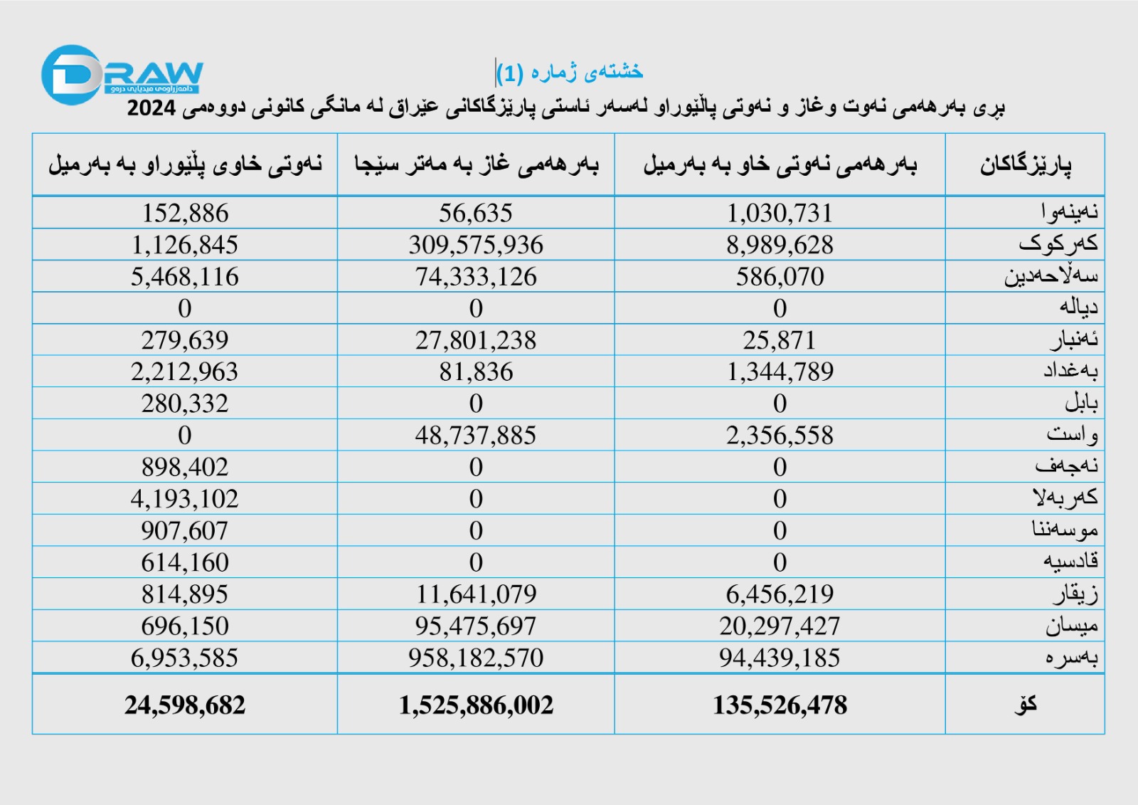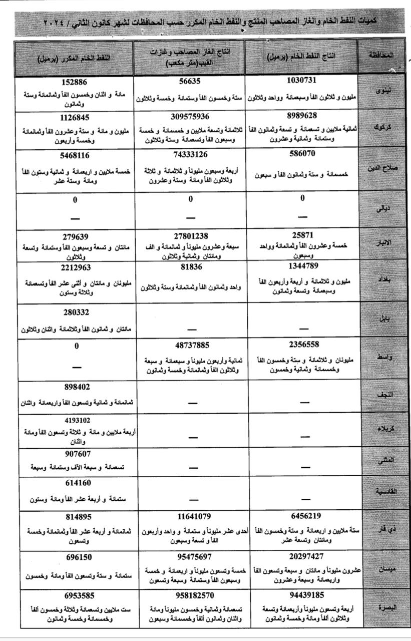 ? مانگی کانونی دووەمی ساڵی (2024)دا لەسەر ئاستی پارێزگاکانی عێراق توانای بەرهەمهێنانی نەوت گەیشتووە بە زیاتر لە (135 ملیۆن و 526 هەزار) بەرمیل نەوتی خاو و هاوشان بەوەش نزیکەی (ملیارێک و 526 ملیۆن) مەتر سێجا غاز بەرهەم هێنراوە، نزیکەی (24 ملیۆن و 600 هەزار) بەرمیل نەوتی خاویش لە ناوخۆدا پاڵێوراوە.