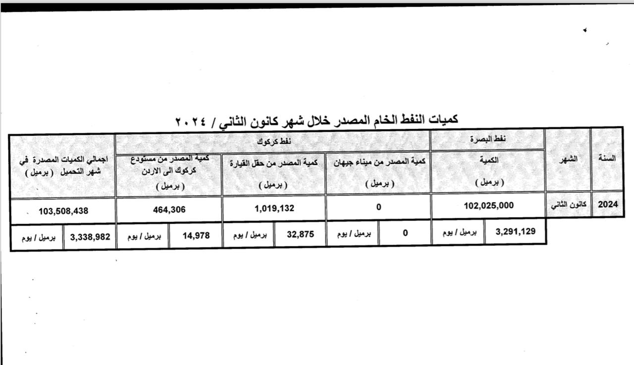 ? لە مانگەکانی کانونی دووەم و شوباتی (2024)دا، لەسەر ئاستی کۆمپانیاکانی نەوتی بەسرە (بەسرە، میسان، وەسەت و زیقار) بڕی (200 ملیۆن و 208 هەزار و 554) بەرمیل نەوت هەناردەکراوە، لە کێڵگەکانی نەوتی کەرکوکیش بڕی (ملیۆنێک و 994 هەزار و 763) بەرمیل هەناردەی کێڵگەی گەیارە (897 هەزار و 432) بەرمیل نەوتی خاو هەناردەی ئوردن کراوە.