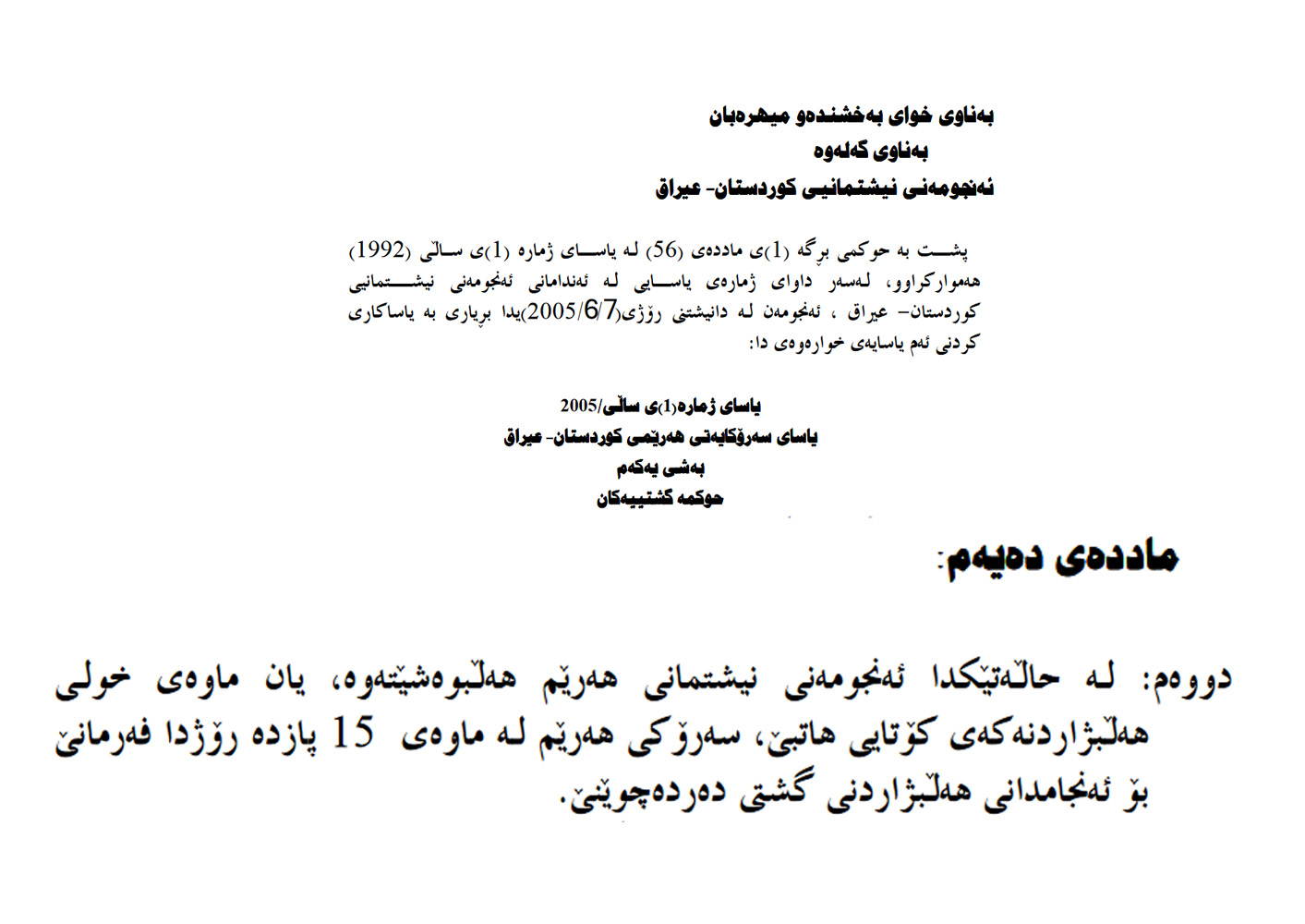 سەرۆكی هەرێمی كوردستان پاڵپشت بە بڕگەی (دووەم) لە مادەی (دەیەم) رۆژی هەڵبژاردن دیاری دەكات و لەو بڕگەیەدا هاتووە: "لە حاڵێكدا پەرلەمانی كوردستان هەڵبوەشێتەوە، یان ماوەی خولی هەڵبژاردنەكە كۆتایی هاتبێ، سەرۆكی هەرێمی كوردستان لەماوەی (15) رۆژدا فەرمان بۆ ئەنجامدانی هەڵبژاردنی گشتی دەردەچوێنێ".
