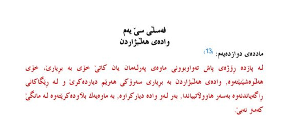 • سەرۆكی هەرێمی كوردستان بە بیانووی پاراستنی ئاساییشی ناوخۆی هەرێمی كوردستان سازانی لایەنەكان، وادەیەكی نوێ دیاری بكات بۆ هەڵبژاردنی خولی شەشەمی پەرلەمانی كوردستان.