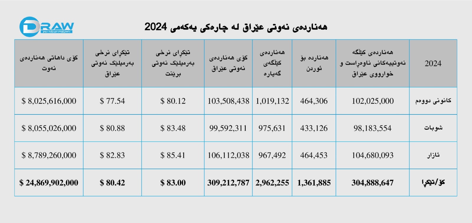 بەم پێیەش بەپێی لێکدانەوەکان، کۆی داهاتی فرۆشراوی نەوتی عێراق لەچارەکی یەکەمی ئەمساڵ بریتی بووە لە بڕی (24 ملیار و 869 ملیۆن و 902 هەزار) دۆلار.