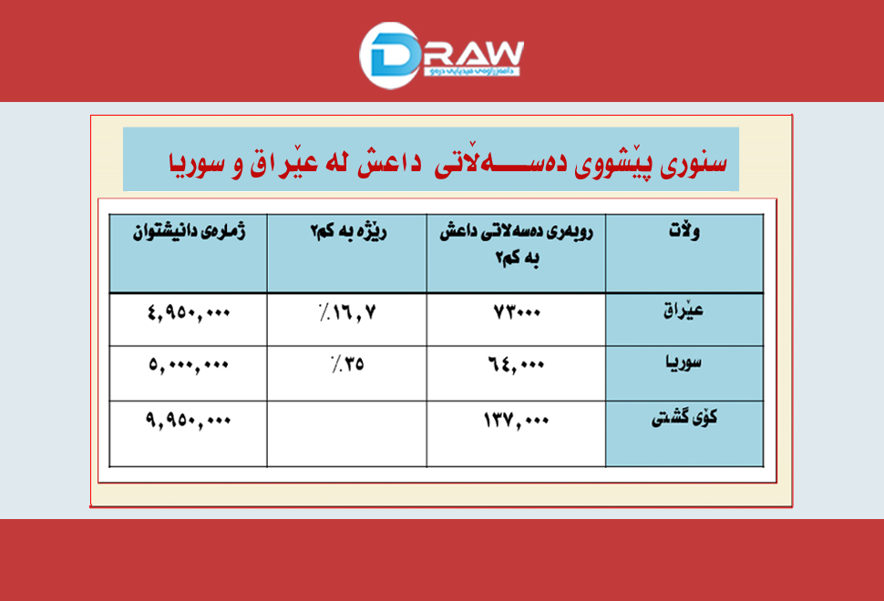 بەو پێیەش رووبەری دەسەڵاتی داعش كە ( 137 هەزار ) كیلۆمەتر دوجا، زیاتر لە ( 12 ) جار لە رووبەری قەتەر زیاتر بووەو ژمارەی دانیشتوانی دەسەڵاتی داعش كە ( 9 ملیۆن و 950 هەزار ) كەسە و ( 5 ) ئەوەندەی ژمارەی دانیشتوانی قەتەرە كە ( 1 ملیۆن و 853 ) كەسە.بەڵام لە ئێستادا داعش هەموو ئەو روبەرو دەسەڵاتەی لە دەستداوە و دەیەوێت بە سود وەرگرتن لە بارودۆخی خراپی ناوچەكە بەدەستی بهێنێتەوە