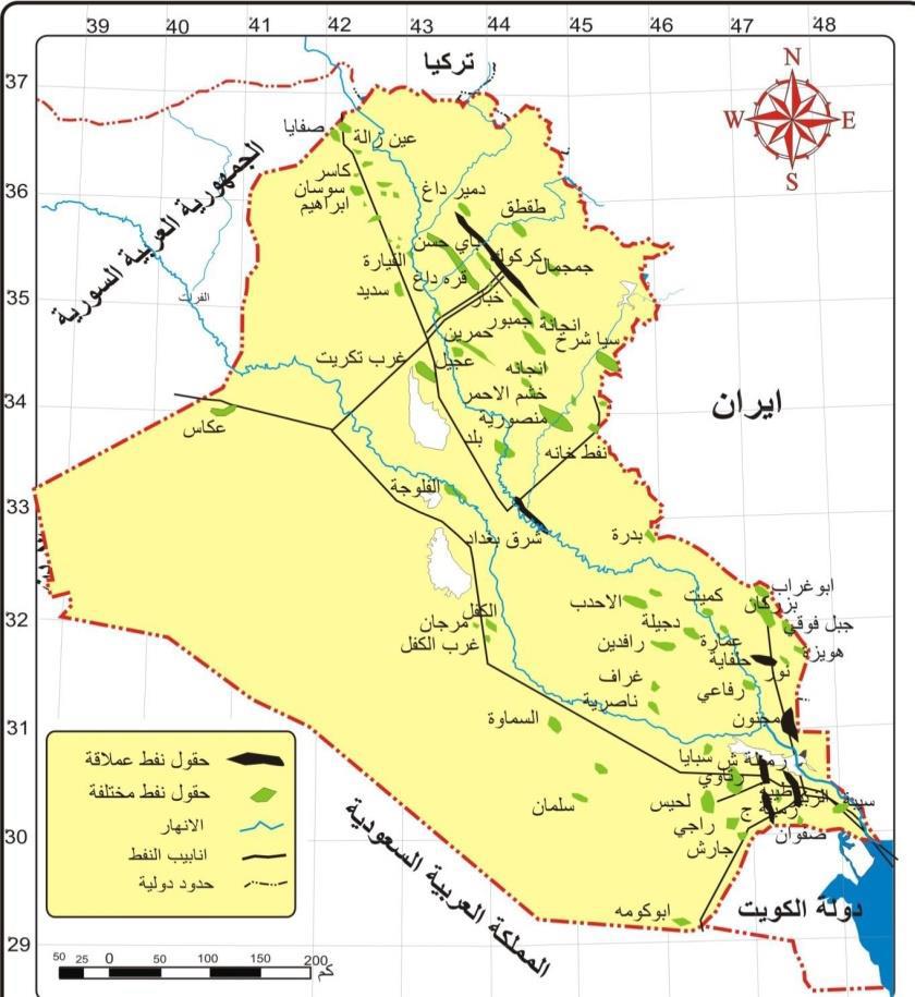 عێراقیش کە خاوەن ژمارەیەکی زۆری کێڵگەی قەبارە جیاوازی نەوتییە، بە ناوچە جیاوازەکانی وڵاتەکەدا بڵابوونەتەوە، بەجۆرێک پلەی پێنجەمی سەر ئاستی جیهان و دووەمی سەر ئاستی وڵاتانی عەرەبی گرتووە لە بوونی یەدەگی نەوتدا، کە یەدەگەکەی بە (142.5 ملیار) بەرمیل دەخەمڵێنرێت، لە ئێستادا بە تێکڕای رۆژانە نزیکەی (3.5 ملیۆن) بەرمیل هەناردەی بازاڕەکانی جیهان دەکات. نەخشەی ژمارە (1) دابەشبوونی کێڵگە نەوتی و گازییەکانی عێراق نیشان دەدات.