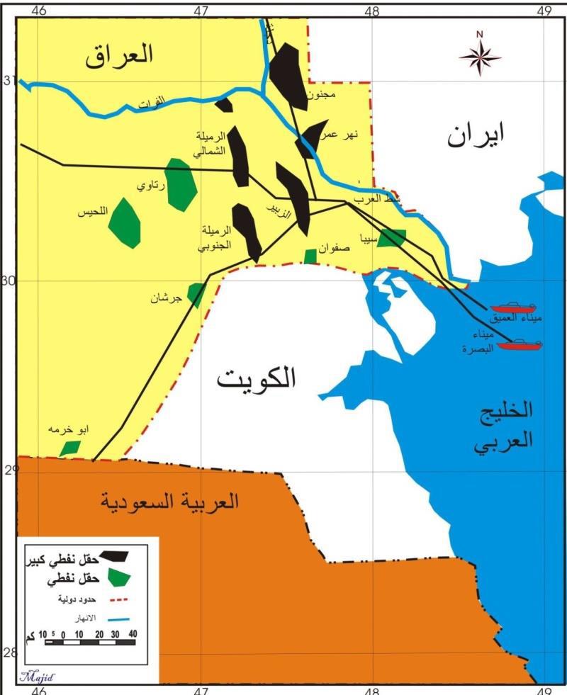 وەک لە (نەخشەی ژمارە (2))دا ڕونکراوەتەوە، عێراق دوو کێڵگەی گەورەی نەوتی نزیک بە سنوری وڵاتی کوەیت هەڵکەوتووە، ئەوانیش؛