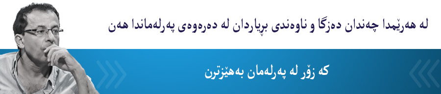 پەرلەمان لە هەرێمدا هەڵقەیەکی لاوازی ناو سیستمێکە کە بڕیارەکانی لەناو بارەگا و ژووری داخراو و دیوەخان و لق و مەڵبەندەکاندا پیادەدەکرێت. پەرلەمانی ڕاستەقینە شوێنی گفتوگۆی ئاشکراو و کراوەیە، شوێنی لێپرسینەوەی بینراو و بەرچاوە، شوێنی پیادەکردنی ئاشکرای ئەو سیاسەتانەیە کە لە وڵاتەکەدا پەیڕەوی دەکرێت. لەهەر شوێنێکدا سیاسەتکردن بەنهینی بوو، رێکەوتنەکان لە ژووری نهێنیدا بوون، کۆنتراکتەکان بەنهێنی بەڕێوەچوون، پەیوەندییەکان بەنهێنی بوو، پەرلەمان هەشبێت، دەزگایەکی مرد و بێئاکار و بێئیش و بێکاریگەرییە.