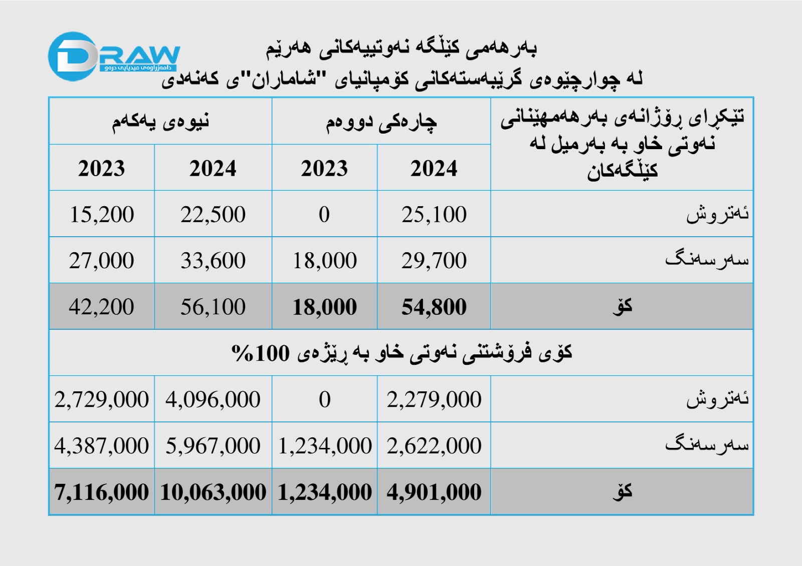 کۆمپانیای شاماران پترۆلیۆمی کەنەدی ڕاگەیاند: لە چارەکی دووەمی ساڵی (2024)دا، داهاتی گشتی کۆمپانیاکە (22 ملیۆن و 630 هەزار) دۆلار بووە، ئەمە لە کاتێکدایە لە چارەکی دووەمی ساڵی ڕابردوو داهاتی گشتی کۆمپانیاکە بریتی بووە لە (6 ملیۆن و 542 هەزار)، واتە بە رێژەی (246%) داهاتی کۆمپانیاکە بەراورد بە چارەکی دووەمی (2023) زیادی کردووە.