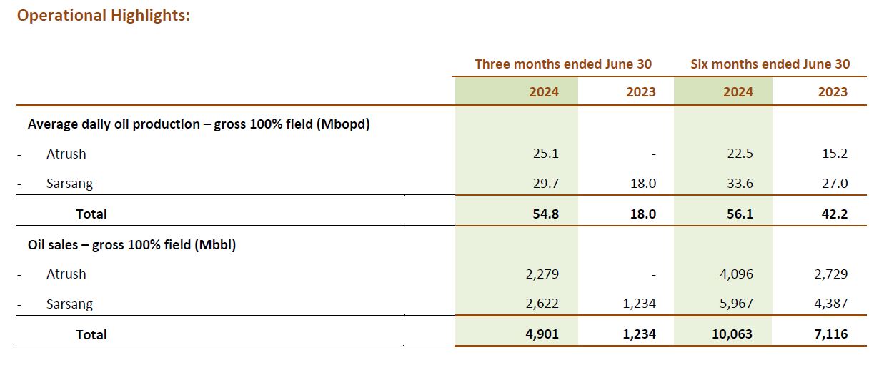 ? هاوکات لە (1/1/2024 – 30/6/2024) لە هەردوو کێڵگەی نەوتی (سەرسەنگ و ئەتروش)، بە تێکڕای کاری رۆژانە (56 هەزار و 100) بەرمیل نەوت بەرهەمهێندراوە، بە کۆی گشتی بڕی (10 ملیۆن و 63 هەزار) بەرمیل نەوتی خاو فرۆشراوە. لە کاتێکدا لە نیوەی یەکەمی ساڵی (2023) کۆمپانیاکە بە تێکڕای کاری رۆژانە (42 هەزار و 200) بەرمیل نەوتی بەرهەمهێناوەو بە کۆی گشتی بڕی (7 ملیۆن و 116 هەزار) بەرمیل نەوتی خاوی فرۆشتبوو.