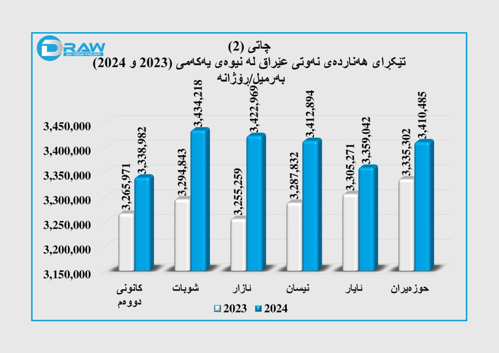? لە نیوەی یەکەمی ساڵی (2023) تێکڕای نرخی بەرمیل نەوتی فرۆشراوی عێراق بریتی بووە لە (74 دۆلار و 54 سەنت). بەڵام لە نیوەی یەکەمی (2024) هەر بەرمیلێکی نەوت بەتێکڕا دراوە بە (80 دۆلار و 38 سەنت). کەواتە نرخی هەر بەرمیلێک نەوتی خاوی فرۆشراو بە تێکڕا (8%) و بڕی (5 دۆلار و 83 سەنت) گرانتر ساغکراوەتەوە.