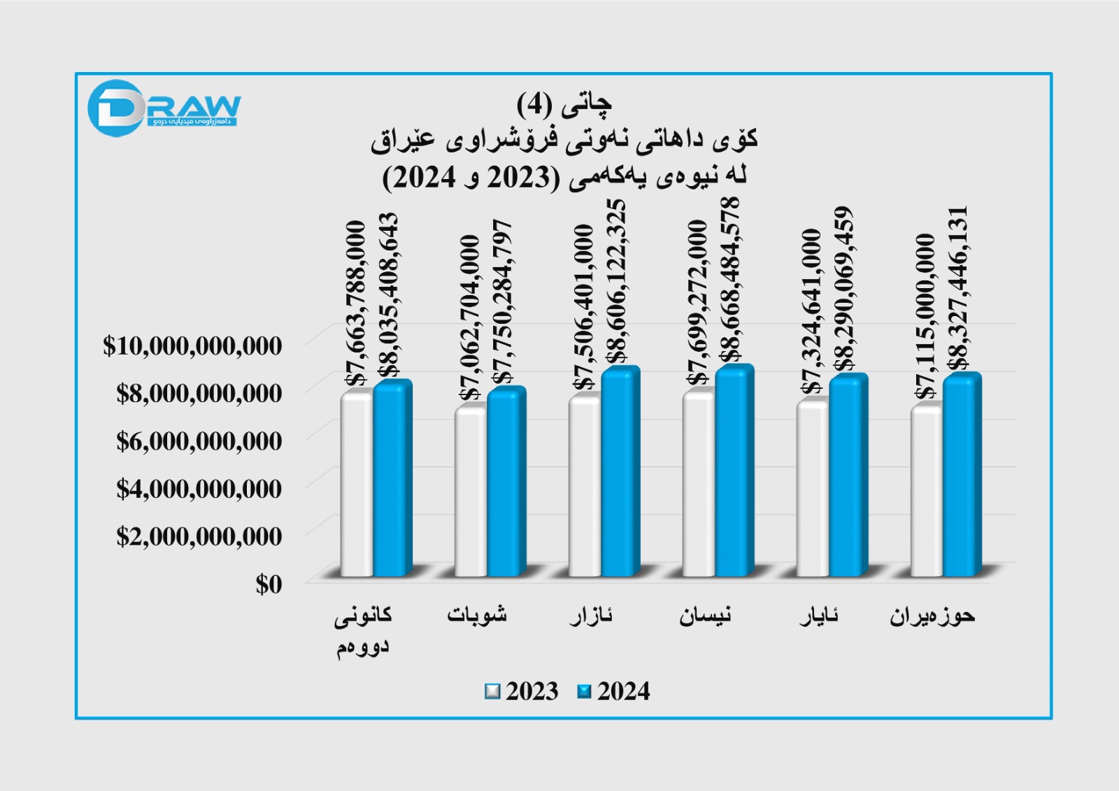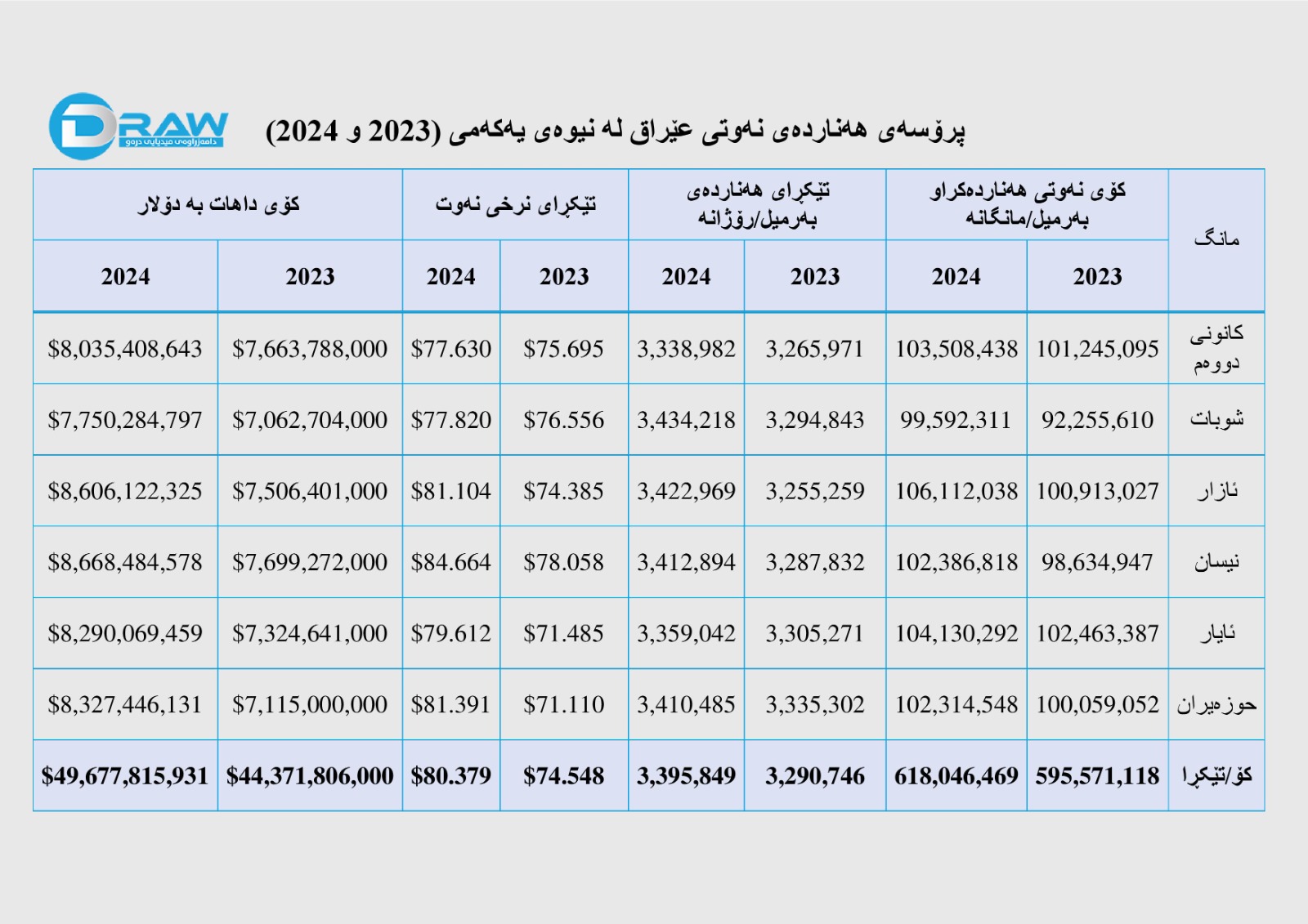 ? کۆی داهاتی نەوتی فرۆشراوی عێراق لە شەش مانگی یەکەمی (2023) بریتی بووە لە نزیکەی (44 ملیار و 372 ملیۆن) دۆلار. لە کاتێکدا لە شەش مانگی یەکەمی (2024) کۆی داهاتی نەوتی عێراق گەیشتووە بە نزیک لە (49 ملیار و 678 ملیۆن) دۆلار. بەم پێیەش داهاتی نەوتی عێراق بە ڕێژەی (12%)و بڕی (5 ملیار و 306 ملیۆن) دۆلار زیادی کردووە.
