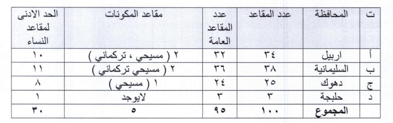 بەگوێرەی خشتەی كۆمسیۆنی هەڵبژاردنەكان، لەكۆی (100) كورسی پەرلەمانی داهاتووی كوردستان، دەبێت لانی كەم (30) كورسییان ژنان پڕی بكەنەوە، بەمشێوەیە: