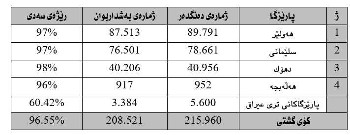 بەجۆرێك كە (2.899.578) كەس لەسەر ئاستی گشتی پارێزگانی هەرێمی كوردستان كارتی نوێی دەنگدانیان وەرگرتۆتەوە، لەو ژمارەیەش (2.683.618) كەس بە ڕێژەی (93%) لە دەنگدانی گشتی كە بەسەر (173) ناوەندی تۆمار كە دابەش بووە (1266) بنكەی هەڵبژاردن و (6318) وێستەگە لە خۆ دەگرێت. لە لایەكی ترەوە (215.960) كەسیش بە ڕێژەی (35%) لە دەنگدانی تایبەت لە (109) ناوندی تۆمار كە دابەش بووە بەسەر (165) بنكەی هەڵبژاردن و (749) وێستەگە لەخۆدەگرێت مافی بەشداریكردنیان لە هەڵبژاردنكەدا هەیە. ئەگەر ئەوە وردبكرێتەوە بۆ سەر ئاستی پارێزگاكان ئەوا: