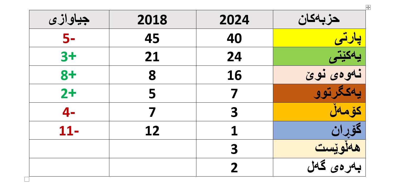 بە سێ حزب (20) كورسی كەمیانكردووە، سێ حزبیش (13) كورسی زیادیانكردووە، پارتی دەنگی زیادیكردووەو كورسی كەمیكردووە. كۆمەڵ و گۆڕان بە دەنگ و كورسی كەمیانكردووە، یەكێتی و نەوەی نوێ و یەكگرتوو، بە دەنگ و كورسی زیادیانكردووە