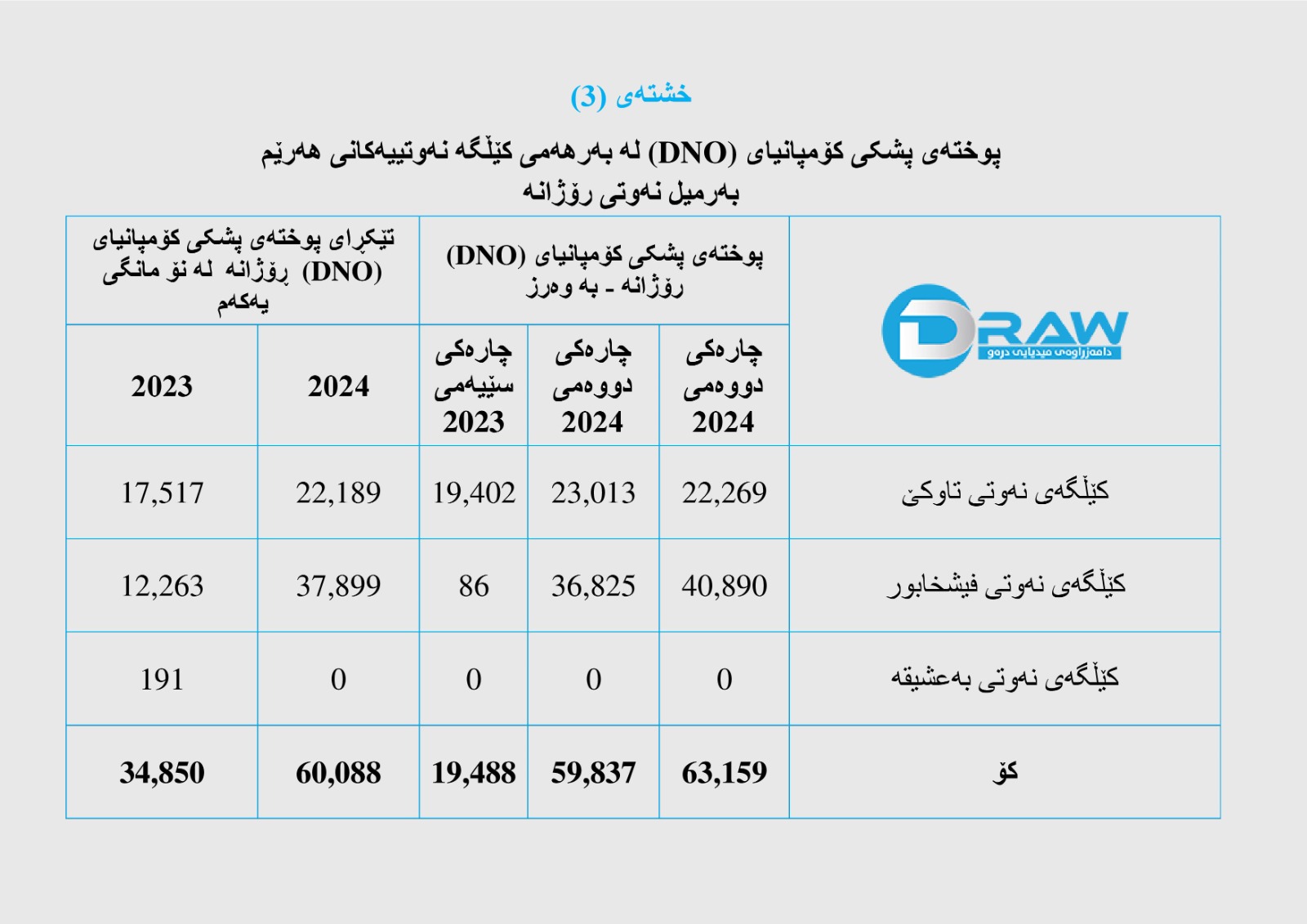 سێیەم؛ بەرهەمی کاری (DNO) لە کێڵگە نەوتیەکانی هەرێمی کوردستان لە چارەکی سێیەمی (2024)دا
