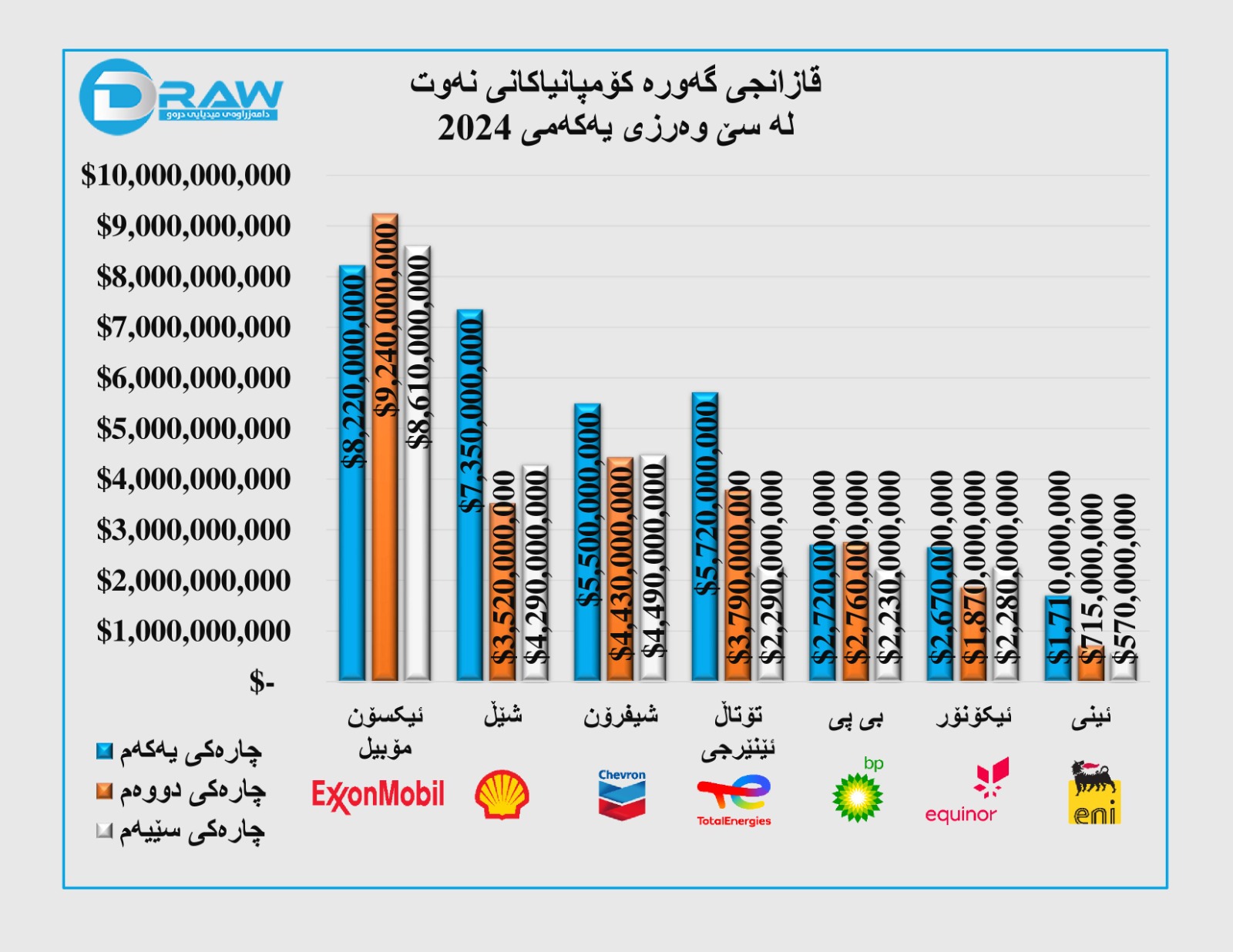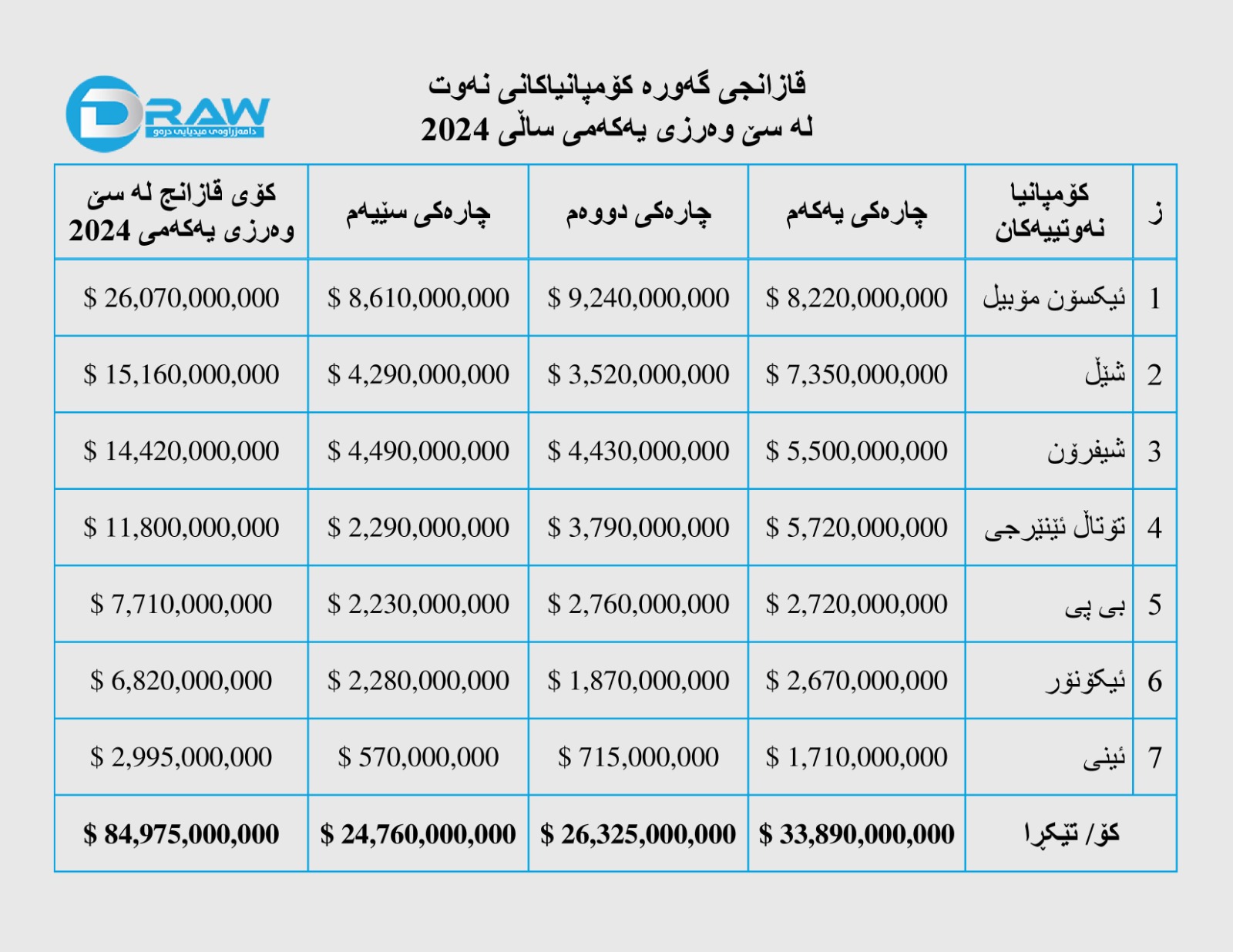 ? لە سێ چارەکی یەکەمی ساڵی (2024)دا حەوت گەورە کۆمپانیای نەوت و غازی وەک؛ (ئیکسۆن مۆبیل، شێڵ، شیڤرۆن، تۆتاڵ، بی پی، ئکوینۆر و ئینی) بڕی (84 ملیار و 975 ملیۆن) دۆلار قازانجیان کردووە.