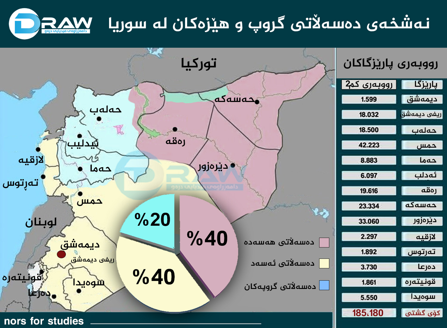 سوریا لە (14) پارێزگا پێكهاتووەو رووبەرەكەی (185 هەزارو 180) كیلۆمەتر دوجایە ئێستا دابەشبووە بەسەر هێزوو گروپ و دەسەڵاتی بەشار ئەسەددا بەم شێوەیە: