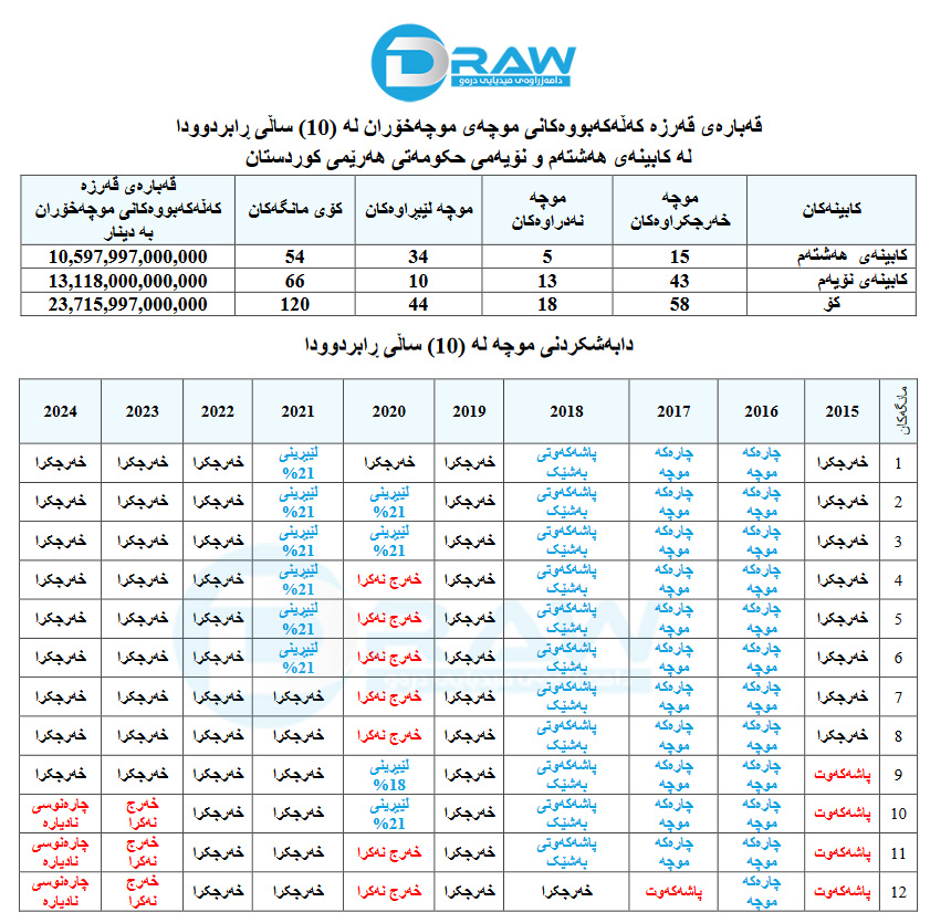 رۆژی (18/10/2024) وەزارەتی دارایی هەرێمی كوردستان دوایین موچەی دابەشكردووە كە موچەی مانگی ئەیلولی (2024)ە، تا ئێستا كە لە مانگی كانونی یەكەمداین هێشتا موچەی مانگی تشرینی یەكەم و تشرینی دووەم دابەشنەكراوە، لە كاتێكدا موچەخۆرانی عێراق موچەی مانگی تشرین یەكەم و دووەمیشیان وەرگرتووە.