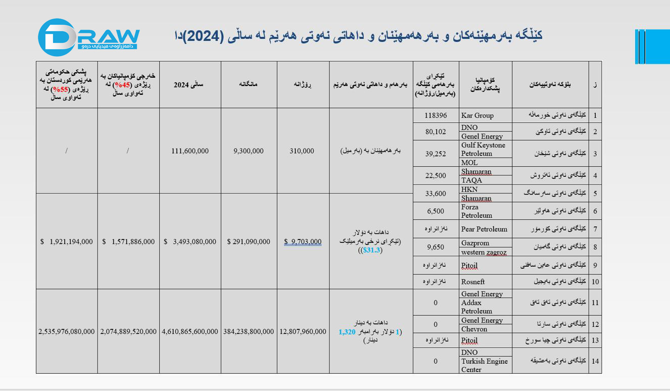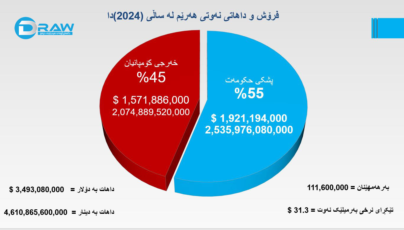 لە ساڵی 2024دا لە كێلگەكانی هەرێمی كوردستاندا رۆژانە (310 -320) هەزار بەرمیل نەوت فرۆشراوە، كۆی داهاتەكەی (4 ترلیۆن و 610 ملیار) دینار بووە، (2 ترلیۆن و535 ملیار ) دیناری بۆ حكومەت و (2 ترلیۆن و 74 ملیار ) دیناری بۆ كۆمپانیاكان بووە.