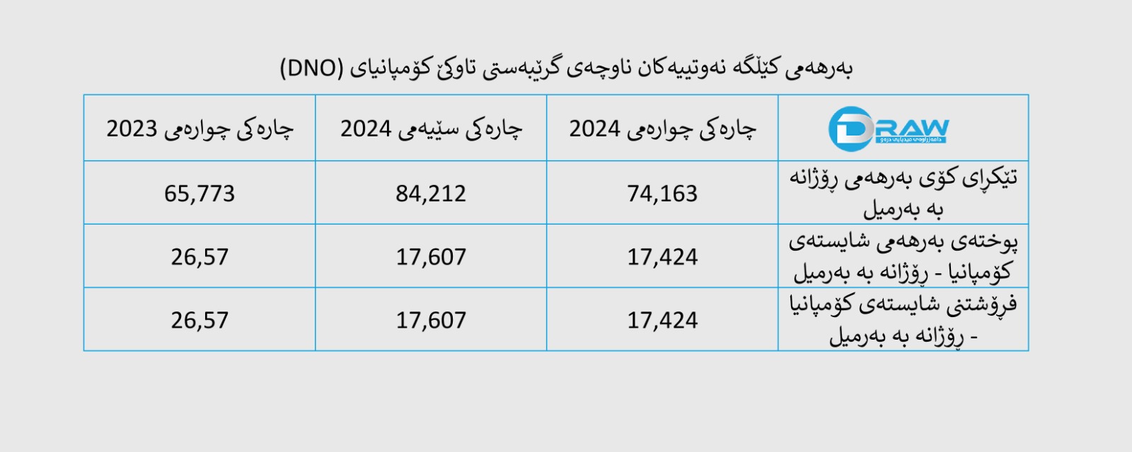 پاڵپشت بەو داتایانەی کۆمپانیای (DNO) بڵاوی کردووەتەوە، لە ڕابردووشدا وەرزانە ڕاپۆرتی کارو چالاکییەکانی خۆی لە کێڵگە نەوتییەکانی هەرێمی کوردستان بڵاوکردووەتەوە، لە سەرجەم ئەو ناوچەو کێڵگانەی پشکدارە تێیدا، لە تەواوی ساڵی (2024)دا بە تێکڕای رۆژانە (78 هەزار و 617) بەرميل نەوتی خاوی بەرهەمهێناوەو لە تەواوی ساڵدا بەرهەمەکەی بریتی بووە لە (28 ملیۆن و 695 هەزار و 205) بەرمیل نەوت لە خشتەی خوارەوەدا، رونکراوەتەوە، کە بەشێوەی وەرزی (چارەکە ساڵ)ەکانی ڕابردوو بەرهەمی کێڵگە نەوتییەکانی هەرێمی کوردستان لە چی ئاستێکدا بووە.