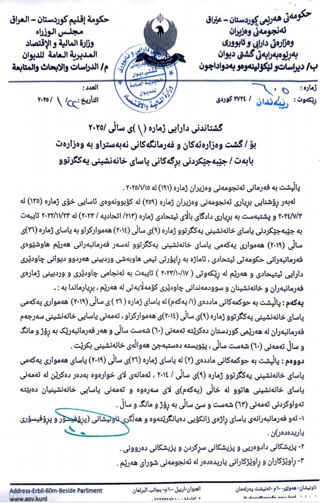 ئەمرۆ وەزارەتی دارایی هەرێمی كوردستان گشتاندنی بۆسەرجەم وەزارەت و دام و دەزگاكانی هەرێم كرد بە ژمارە ( ١ ) ی ساڵی ( ٢٠٢٥ )، تایبەت بە جێبەجێکردنی یاسای خانەنشینی یەکگرتوو ژمارە ( ٩ ) ی ساڵی ( ٢٠١٤ ) عێراق.