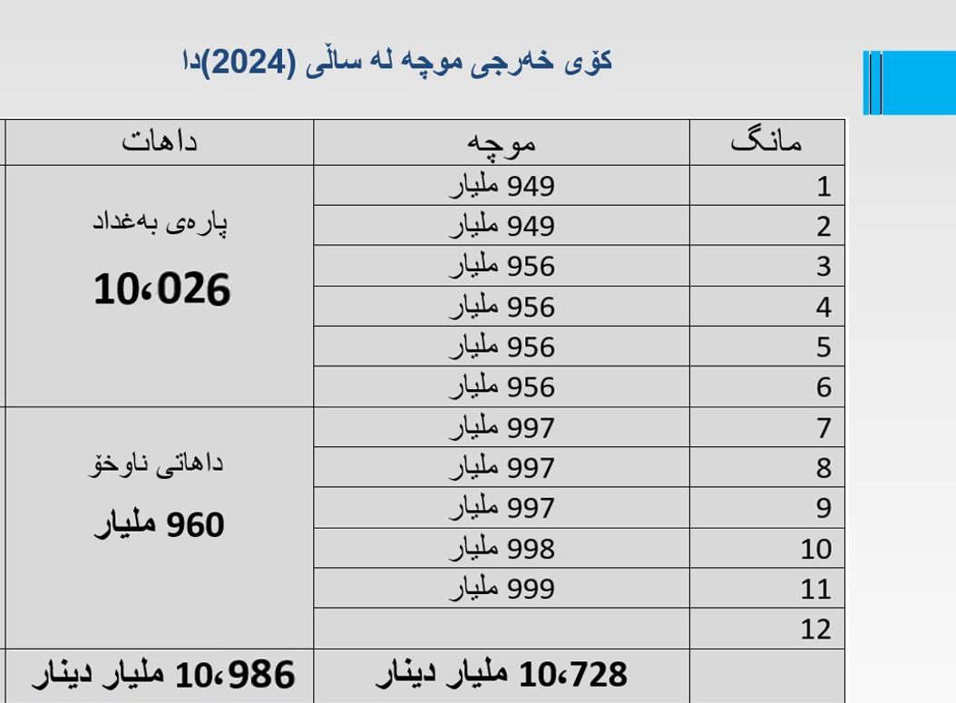 كۆی ئەو پارەیەی بۆ موچەی (11) مانگ لە 2024دا خەرجكراوە دەكاتە: (10 ترلیۆن و 26 ملیار) پارەی بەغداد لەگەڵ (960) ملیار دیناری داهاتی ناوخۆ كە دەكاتە (10 ترلیۆن و 986 ملیار) دینار، لەكاتێكدا كۆی داهاتەكانی هاتووەتە بەردەستی حكومەتی هەرێم ( 16 ترلیۆن و 966 ملیار) دینار بووە.