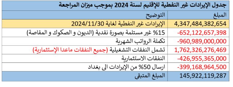 لە (11) ساڵی رابردوودا هێندەی ساڵی 2024 پارە لە بەغدادەوە بۆ هەرێمی كوردستان نەنێردراوە كە (10 ترلیۆن و 26 ملیار) دینار بووە، لە (11) ساڵی رابردوودا هێندەی ساڵی 2024 داهات و پارە لە بەردەستی حكومەتی هەرێمی كوردستاندا نەبووە كە (16 ترلیۆن و 966 ملیار) دینار بووە بە پارەی بەغداد و داهاتی نەوت و ناوخۆ، بەبێ داهاتی نەوتیش (14 ترلیۆن و613 ملیار) دینار داهاتی ساڵی 2024ی عێراق بووە،