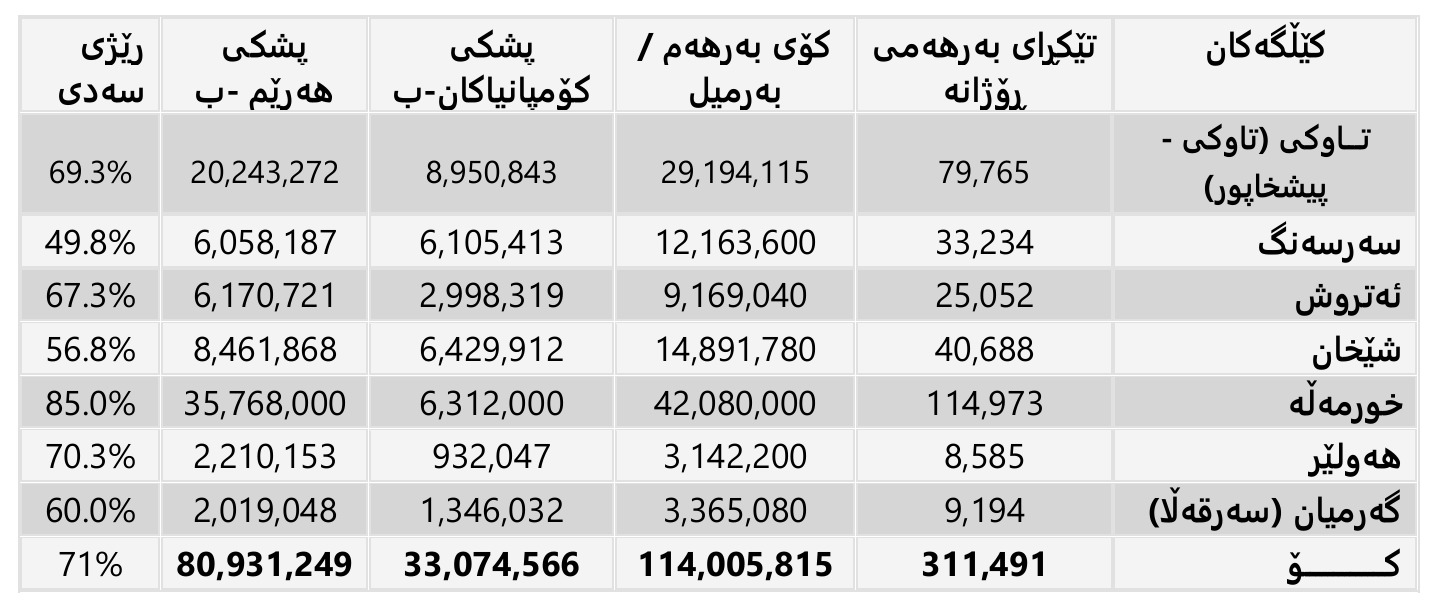 هەر وەک لە خشتەکەی خوارەوەدا هاتووە، ئاستی بەرهەمی ڕۆژانەو کۆی بەرهەم و پشکی کۆمپانیا نەوتییەکان و حکومەتی هەرێمیش کێڵگە بە کێڵگە جیاکراوەتەوە.