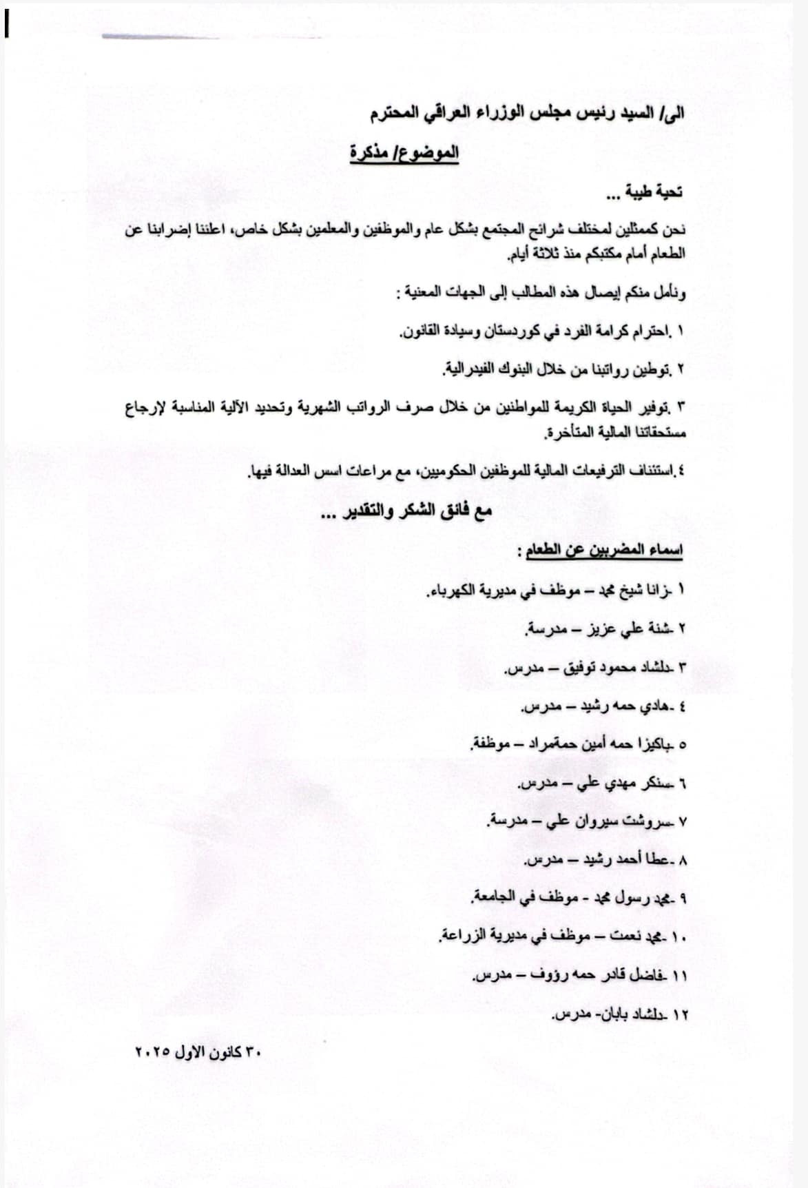 ئەمڕۆ ژمارەیەكی زۆر لە مامۆستایان و فەرمانبەران بە خۆپیشاندان چوونە بەردەم خەیمەی مانگرتووان، مانگرتوان كفنی سپییان لەبەركرد، پێشتر داواكارییەكانیان لە وار خاڵدا خستەڕوو: